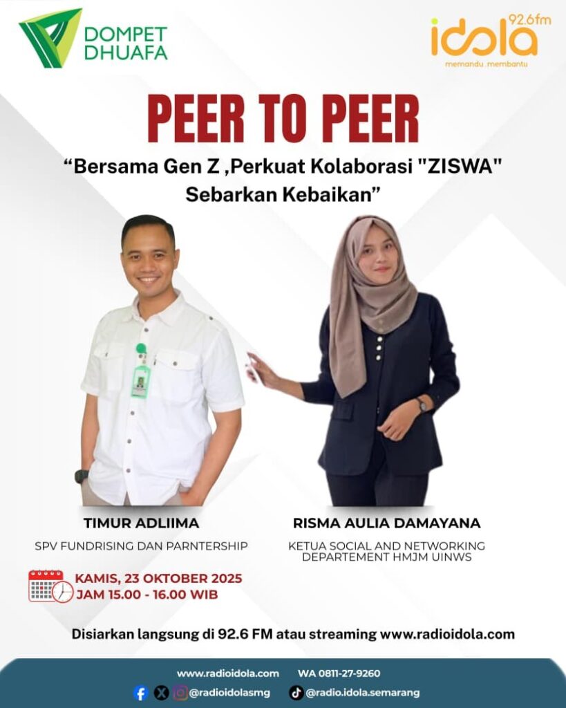 Semarang, 23 Oktober 2025 – Radio Idola 92.6 FM menyelenggarakan talkshow “Peer to Peer: Bersama Gen Z, Perkuat Kolaborasi ‘ZISWA’ Sebarkan Kebaikan” pada hari Kamis, 23 Oktober 2025, pukul 15.00 hingga 16.00 WIB. Acara ini merupakan kolaborasi antara Radio Idola dengan Dompet Dhuafa Jawa Tengah dan disiarkan langsung melalui 92.6 FM serta streaming di www.radioidola.com.