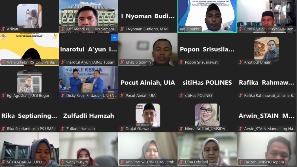 Pasuruan, 24 Juli 2025 — Program Studi Perbankan Syariah dari berbagai perguruan tinggi di Indonesia termasuk perbankan syariah FEBI UIN Walisongo Semarang menggelar Focus Group Discussion (FGD) Visi Keilmuan dan Workshop Kurikulum berbasis Outcome-Based Education (OBE) di Pasuruan, Jawa Timur, pada Rabu, 24 Juli 2025 secara online. Kegiatan ini terselenggara atas kerja sama dengan Asosiasi Program Studi Keuangan dan Perbankan Syariah Indonesia (APSKPS).