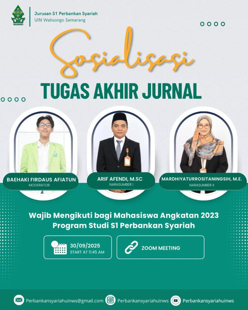 Semarang – Program Studi Perbankan Syariah Fakultas Ekonomi dan Bisnis Islam (FEBI) UIN Walisongo Semarang menggelar sosialisasi terkait kebijakan baru mengenai penggunaan artikel jurnal terindeks Sinta 3 dan 3 atau scopus sebagai pengganti skripsi bagi mahasiswa. Kegiatan ini diikuti oleh mahasiswa angkatan 2023 dan berlangsung dengan penuh antusiasme. Acara dilakukan pada Selasa 30 September 2025 secara online melalui zoom meeting.