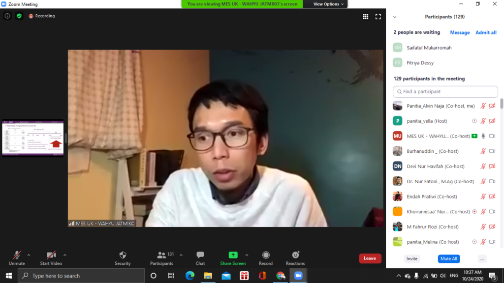 Webinar dihadiri oleh tiga pembicara handal, yaitu Muhammad Zilal Hamzah selaku Dewan Penasehat DPP Ikatan ahli Ekonomi Islam Indonesia, Wahyu Jatmiako selaku Ketua Umum Masyarakat Ekonomi Syari’ah (MES) UK, dan Nur Fatoni selaku Akademisi/Dosen FEBI UIN Walisongo Semarang. Acara berlangsung secara virtual melalui Zoom Meeting yang dihadiri oleh 159 peserta.